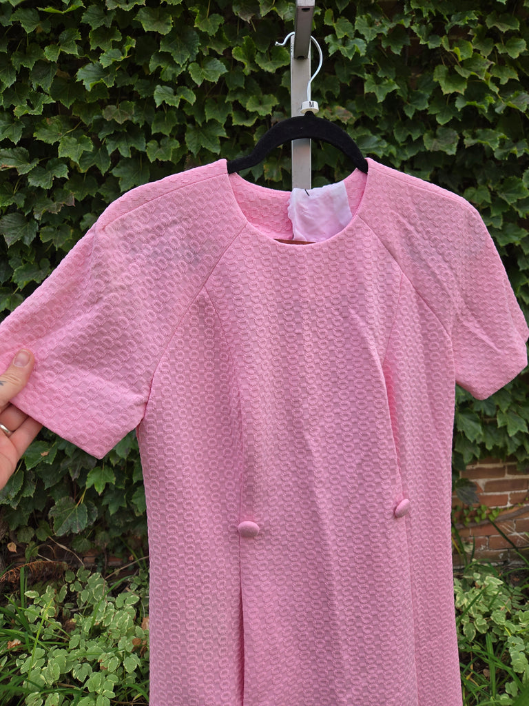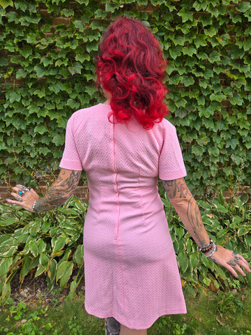 Vintage 1960s A line double knit polyester pastel pink dress with faux buttons and zipper closure on back.