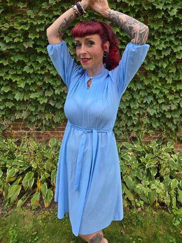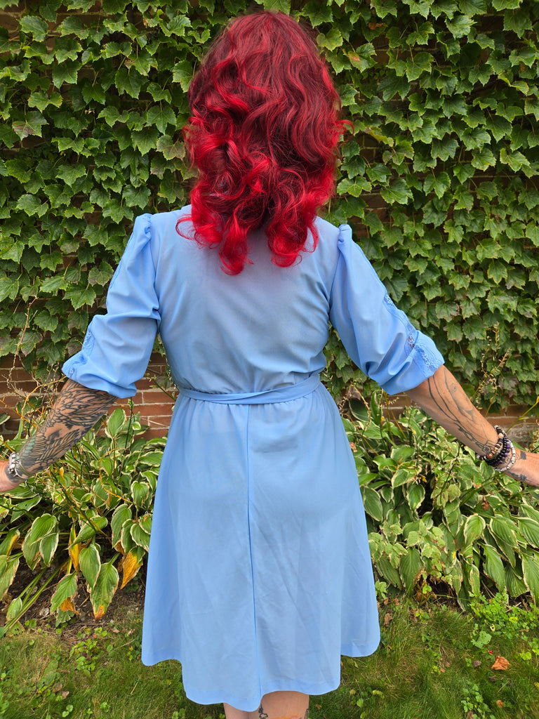 Vintage 70s Pastel blue long sleeve cottage core prairie dress with lace collar and lace cut out down the sleeves, tie belt, button closure at neck, and elastic waist and cuffs.