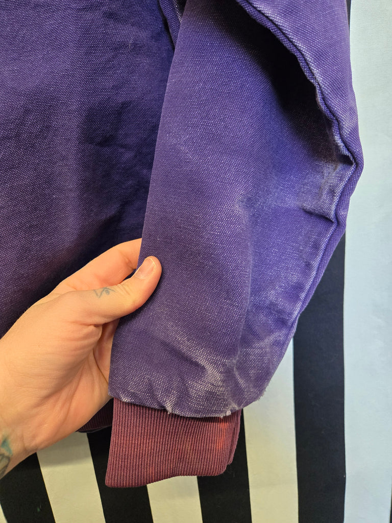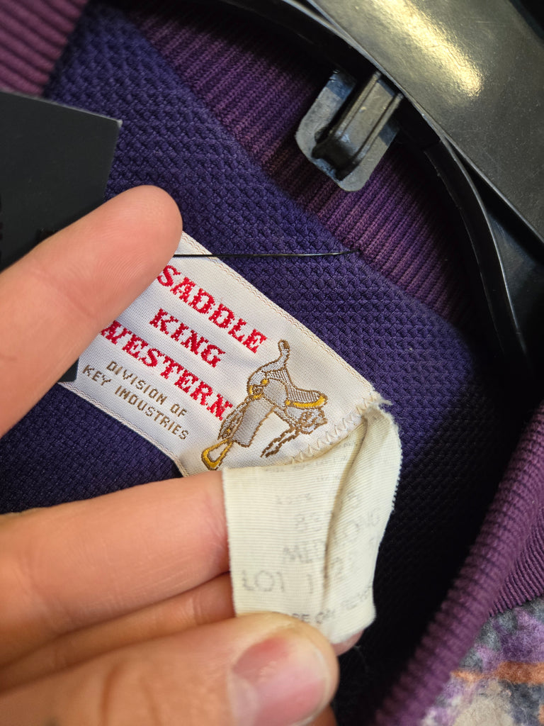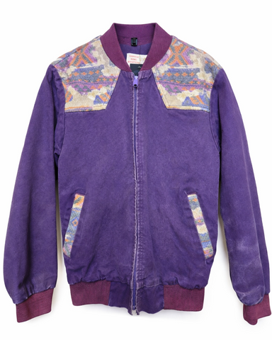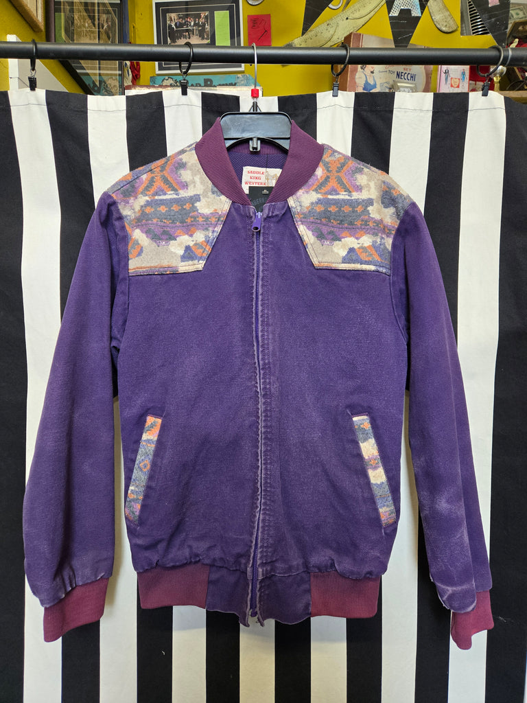 Vintage 80s purple western wear jacket with Mexican blanket print accents on the yolks and on the pockets. Polyester Lining, elastic cuffs and waist, and zipper closur