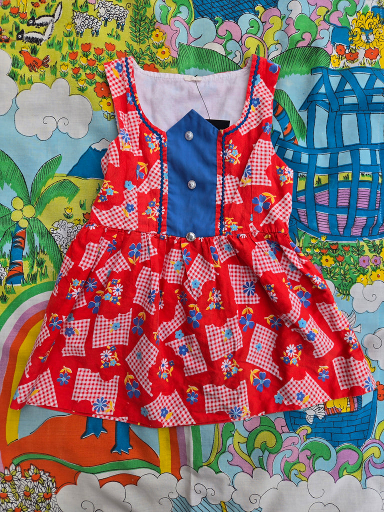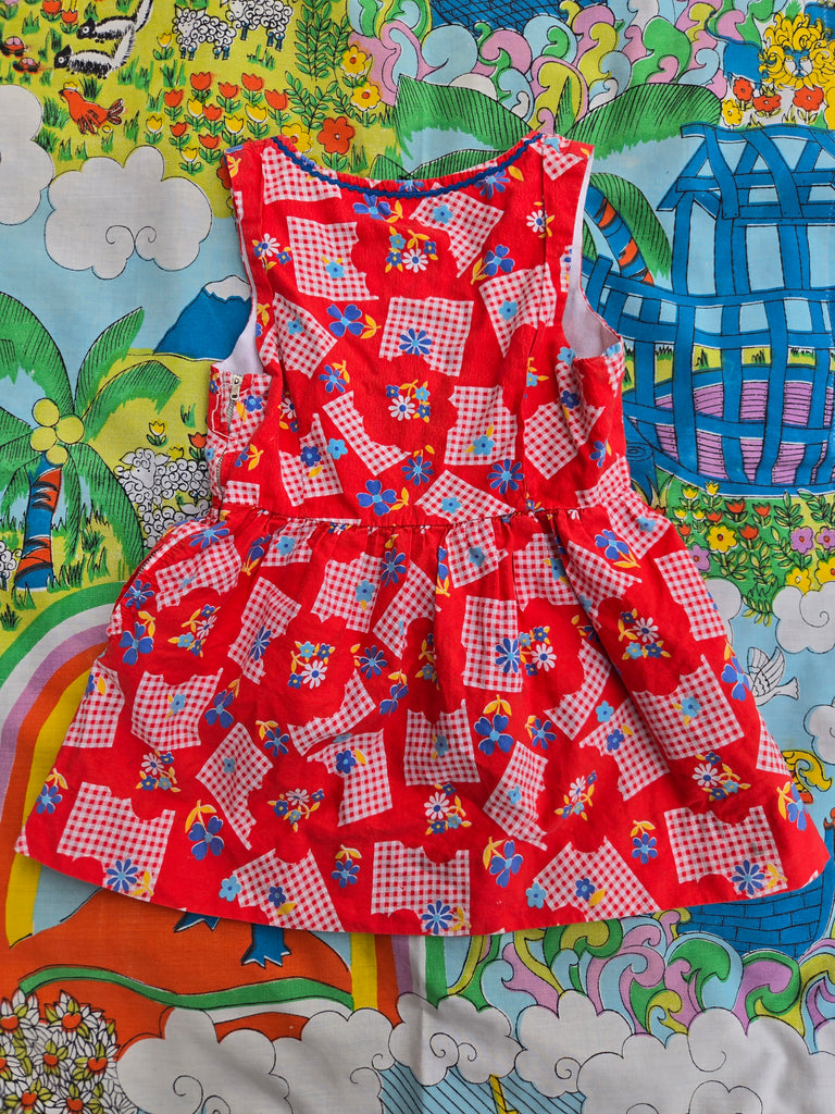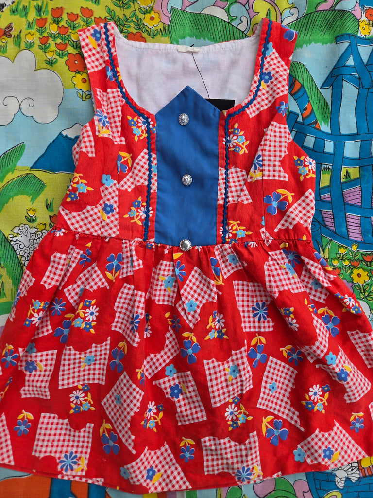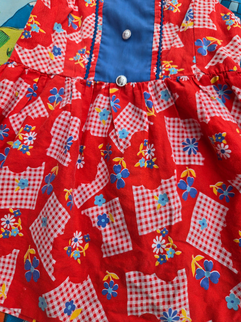 Vintage 1960s red and white gingham patchwork print dress with blue flowersSize: 2/3Bust: 24"Waist: 22"