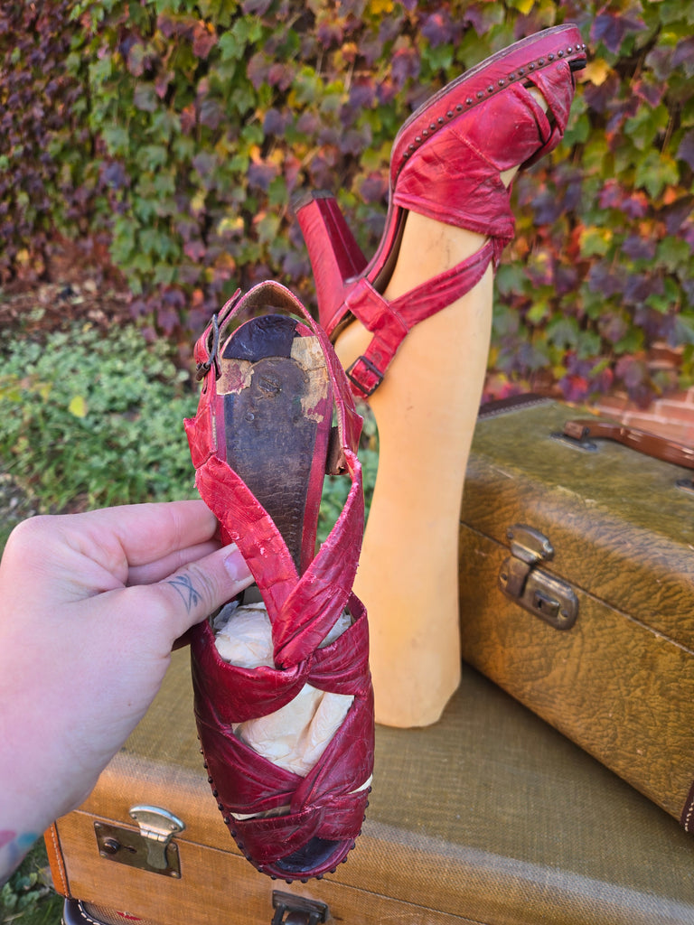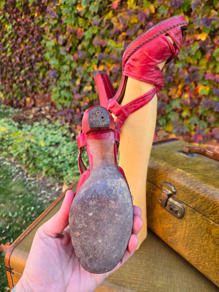 Vintage 1940s red leather peep toe heels with buckle closure and rivets around the heel.