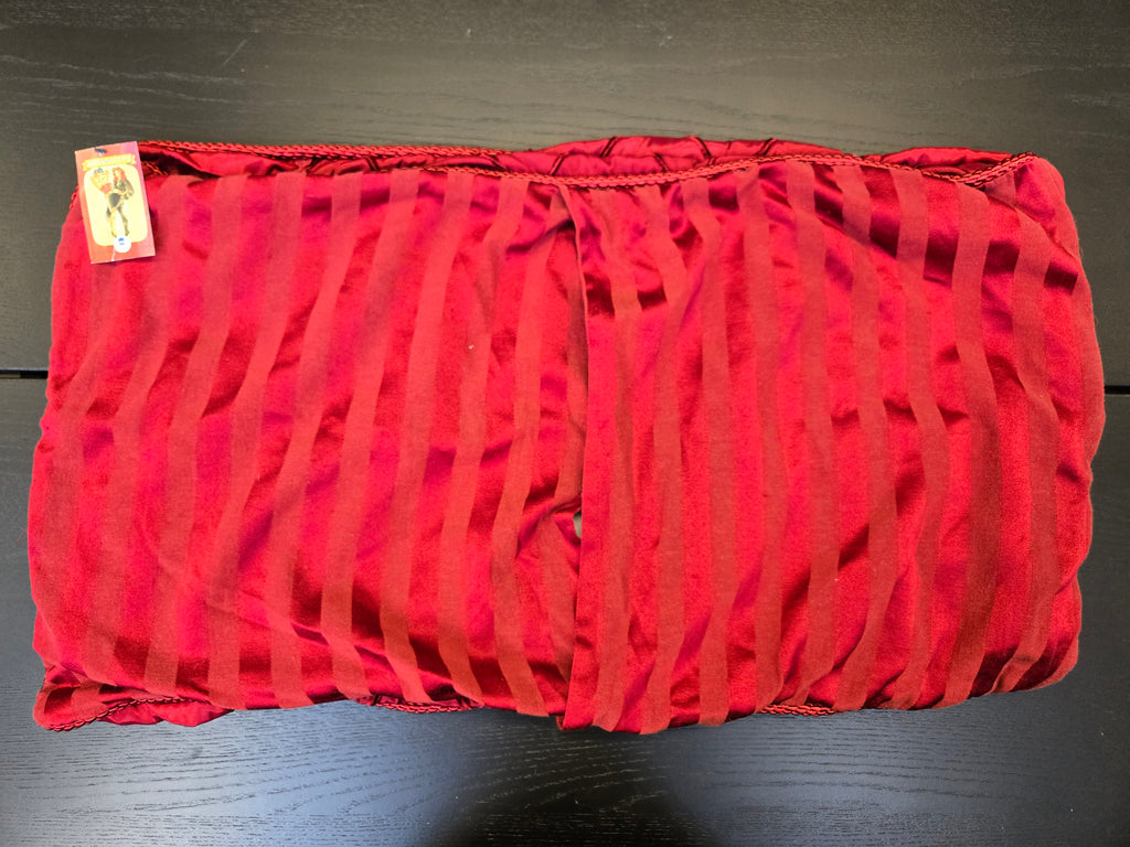 Set of two burgundy striped and embroidered pillow cases. These pillow cases are a synthetic material with striped backing and harlequin embroidered patter on the front.