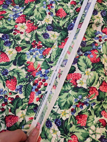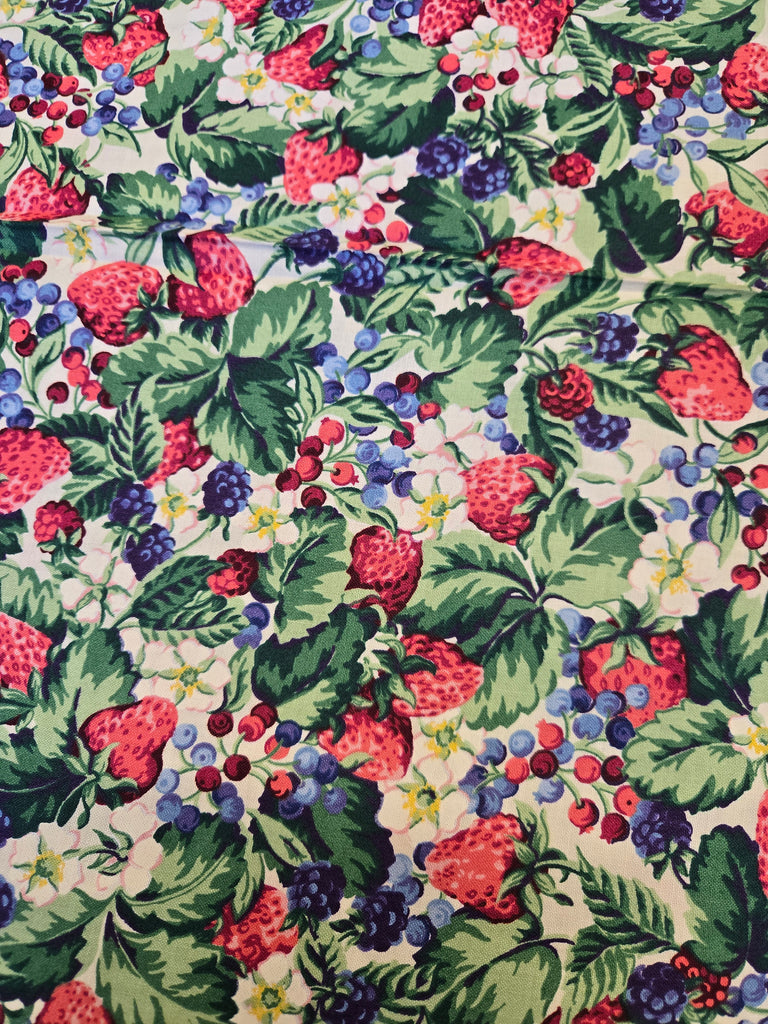 Strawberry blueberry and blackberry print fabric. This fabric looks like it came right off the bolt and was never used. Crisp cotton material that would be perfect for shirting or quilting!