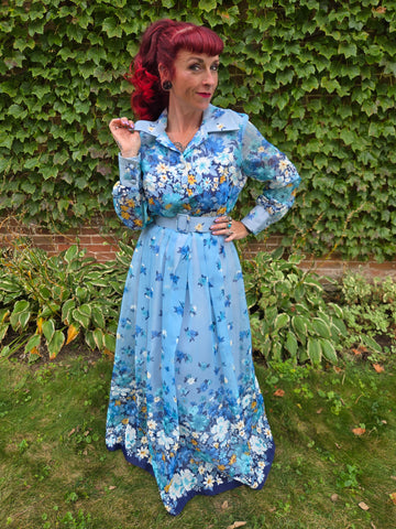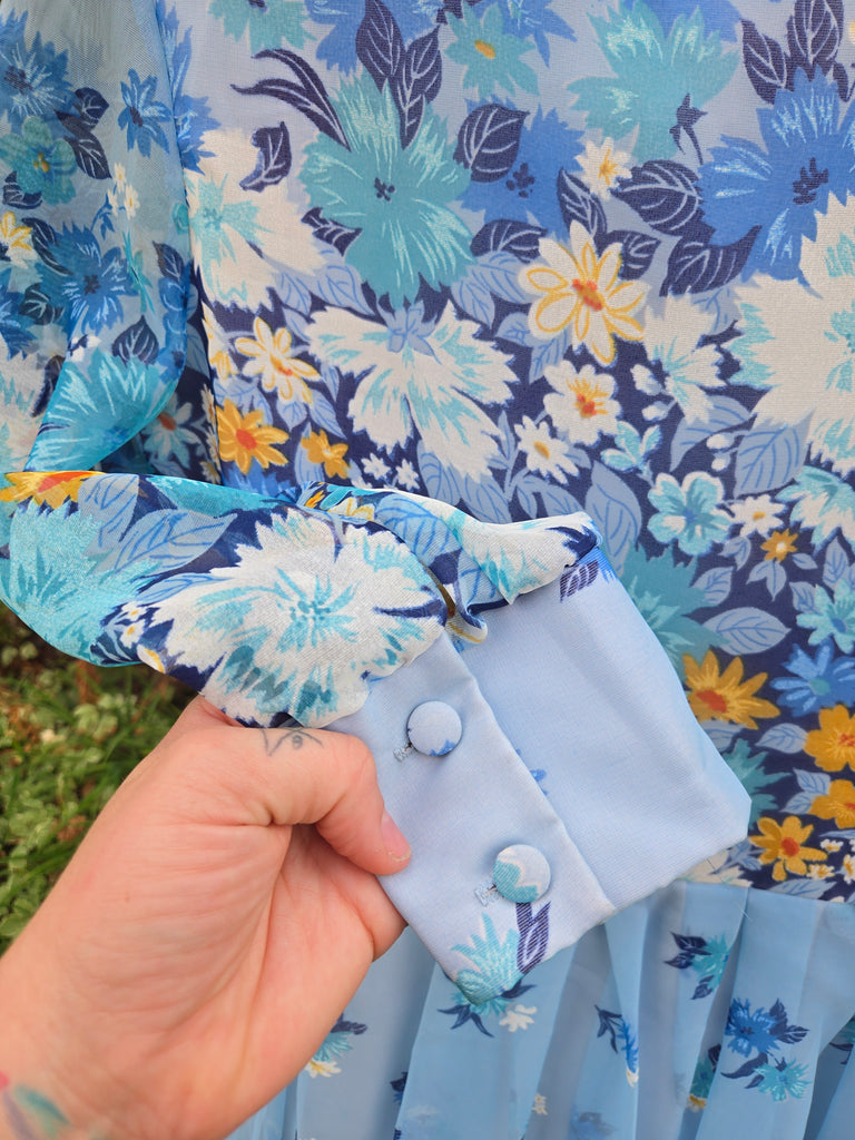 Vintage 1970s Pastel blue floral bodice long sleeve Maxi dress with matching belt, button cuffs, pleated skirt, and zipper in back.