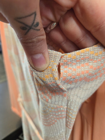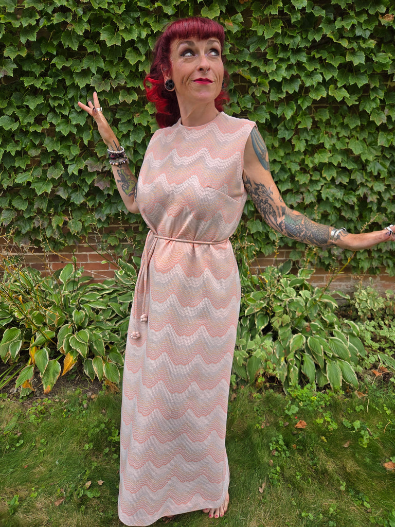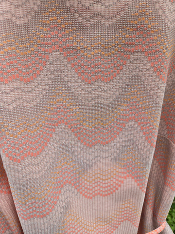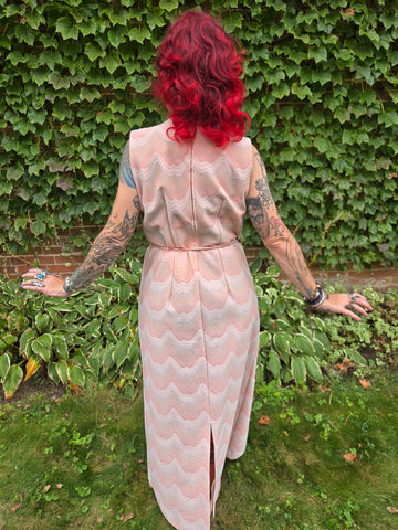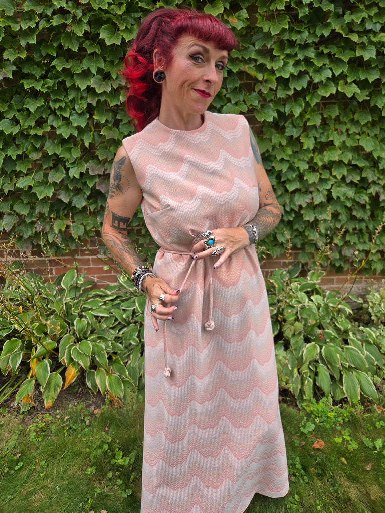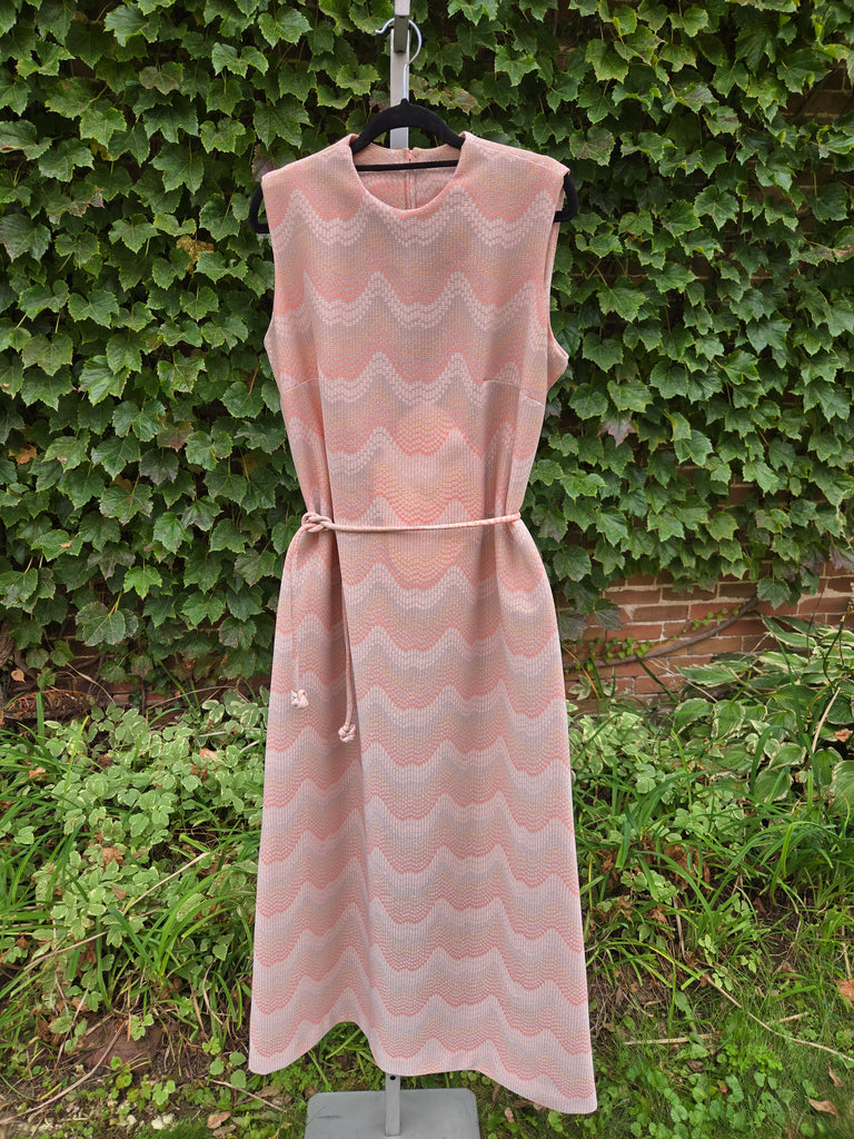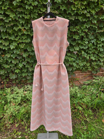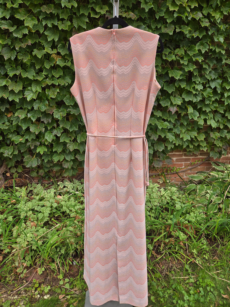 Vintage 1970s pink, orange, and yellow with metallic silver accent zig zag pattern dress with matching belt and zipper closure.