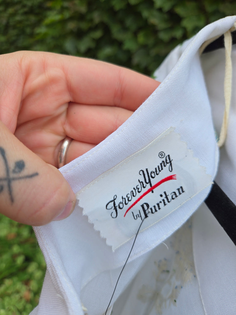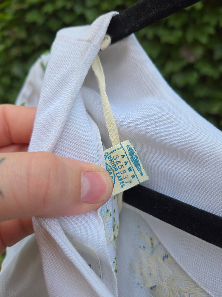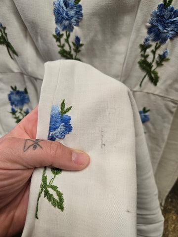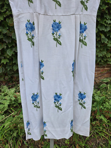 Vintage 1960s white wiggle dress with blue embroidered roses and zipper closure in back.