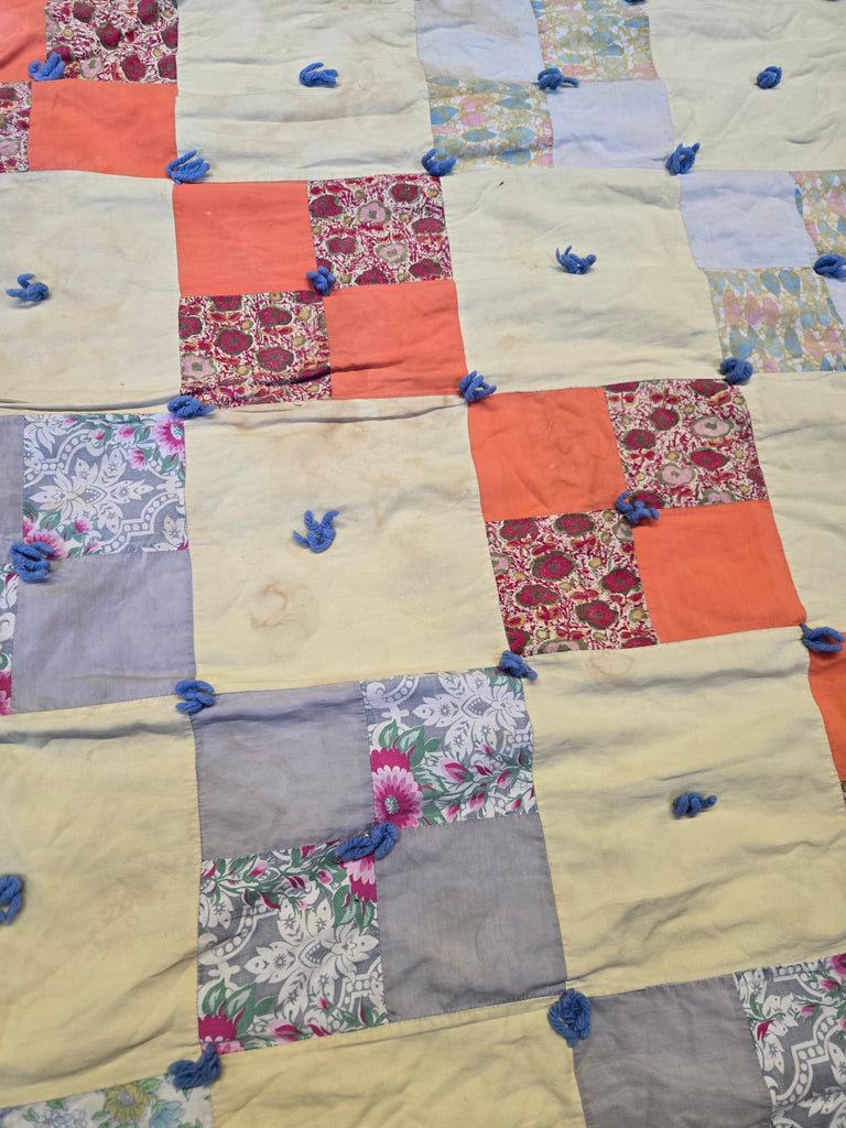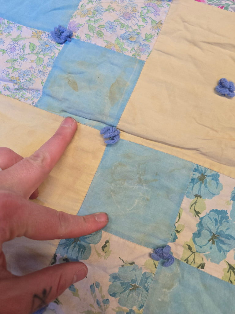 As is handmade waterfall quilt with cotton squares and yarn ties holding the front and back. The back is made with a flannel baby blanket.